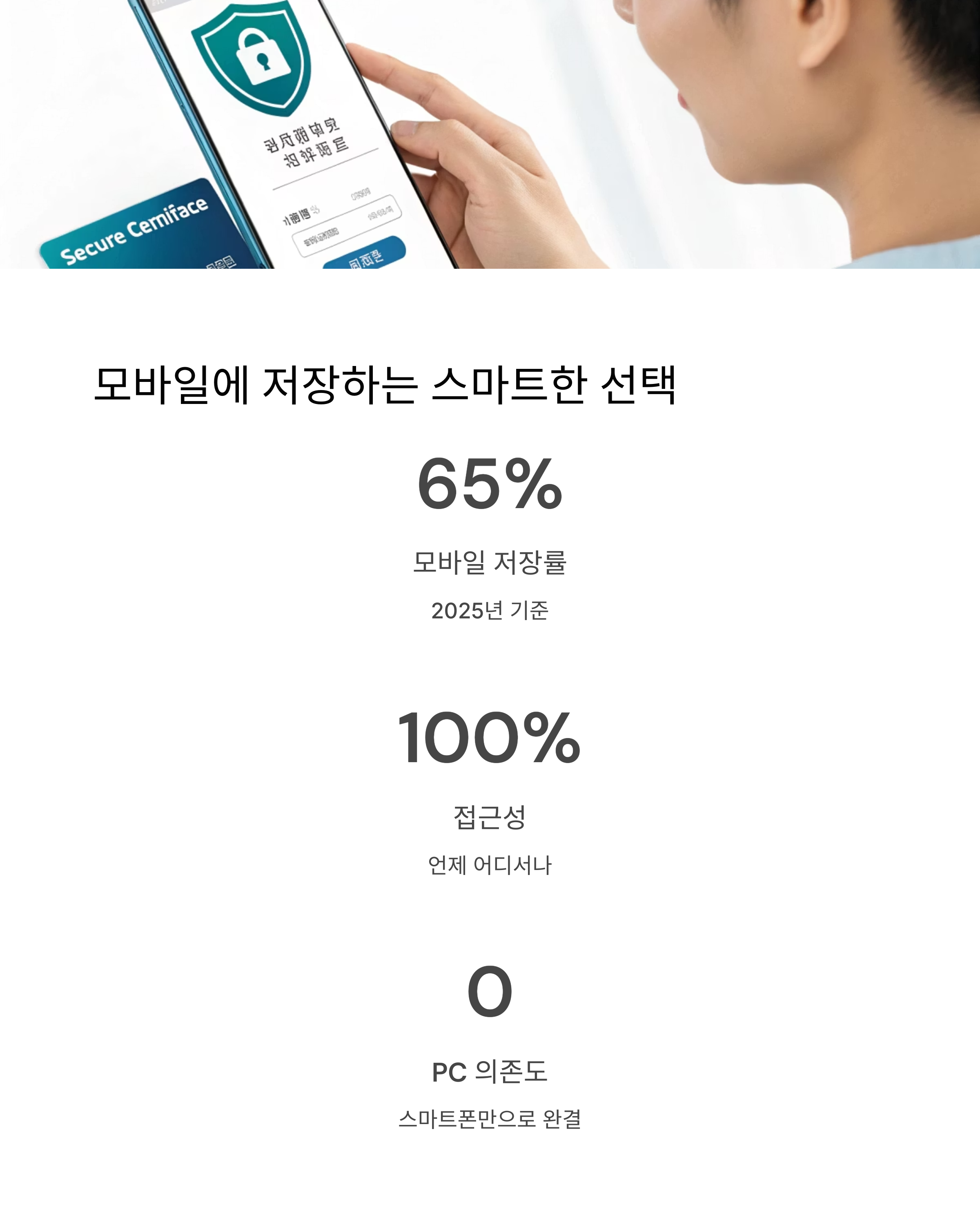| 연간 약 300만 건의 공동인증서가 발급됩니다. | 전체의 65%가 모바일 방식으로 저장됩니다. | 평균 5~10분 내로 발급 절차가 완료됩니다. |