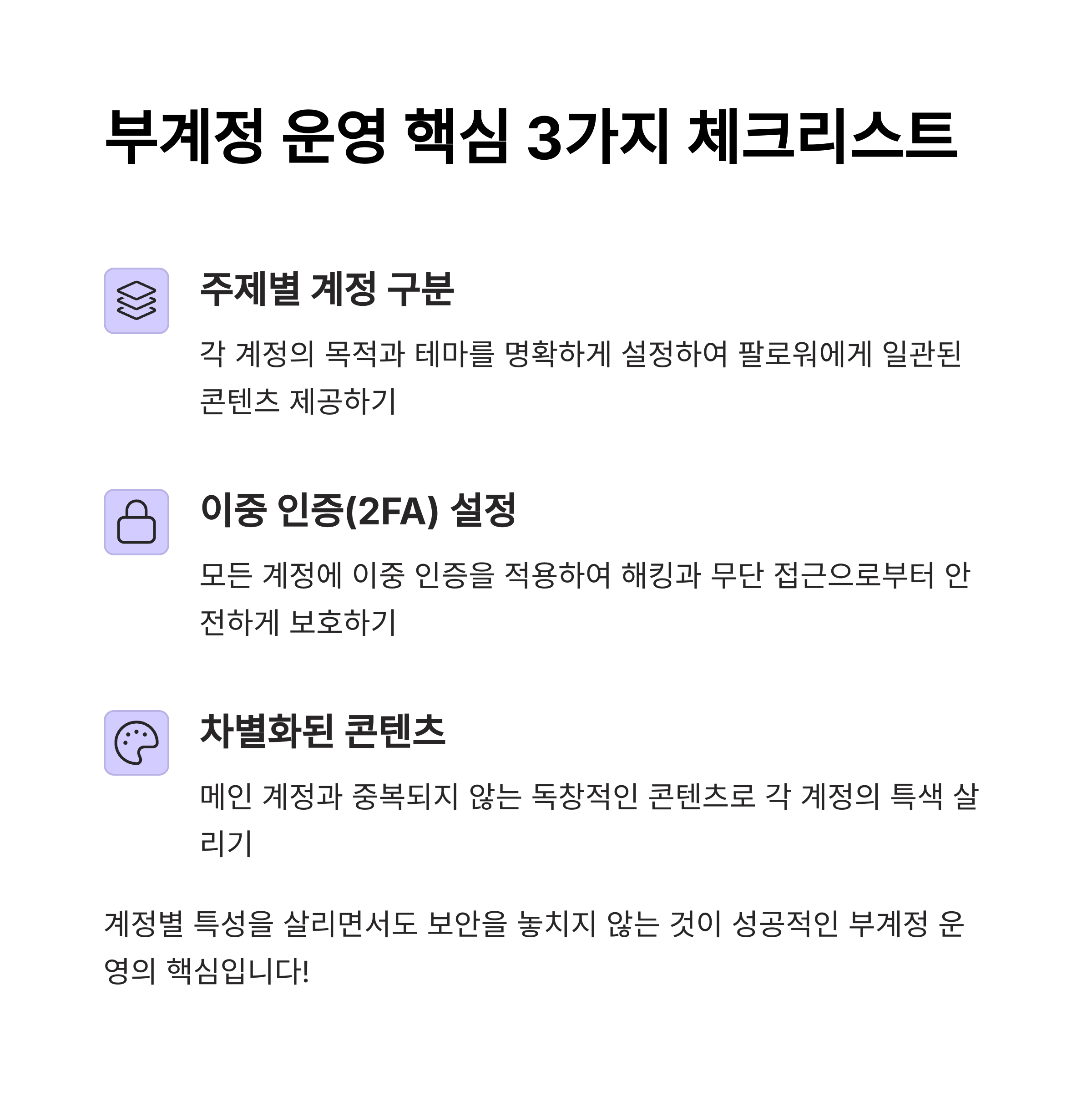 부계정 운영 시에는 본계정과 콘텐츠 주제를 명확히 구분하고, 비밀 계정 설정 및 이중 인증을 활용해 보안을 강화하는 것이 중요합니다. 계정이 많아질수록 관리가 복잡해질 수 있기 때문에 각 계정의 목적을 명확히 하고 일관성 있게 운영해야 합니다. 또한, 동일한 콘텐츠를 여러 계정에 반복 업로드하지 않도록 주의해야 하며, 방치된 계정은 브랜드 이미지에 부정적 영향을 미칠 수 있습니다.