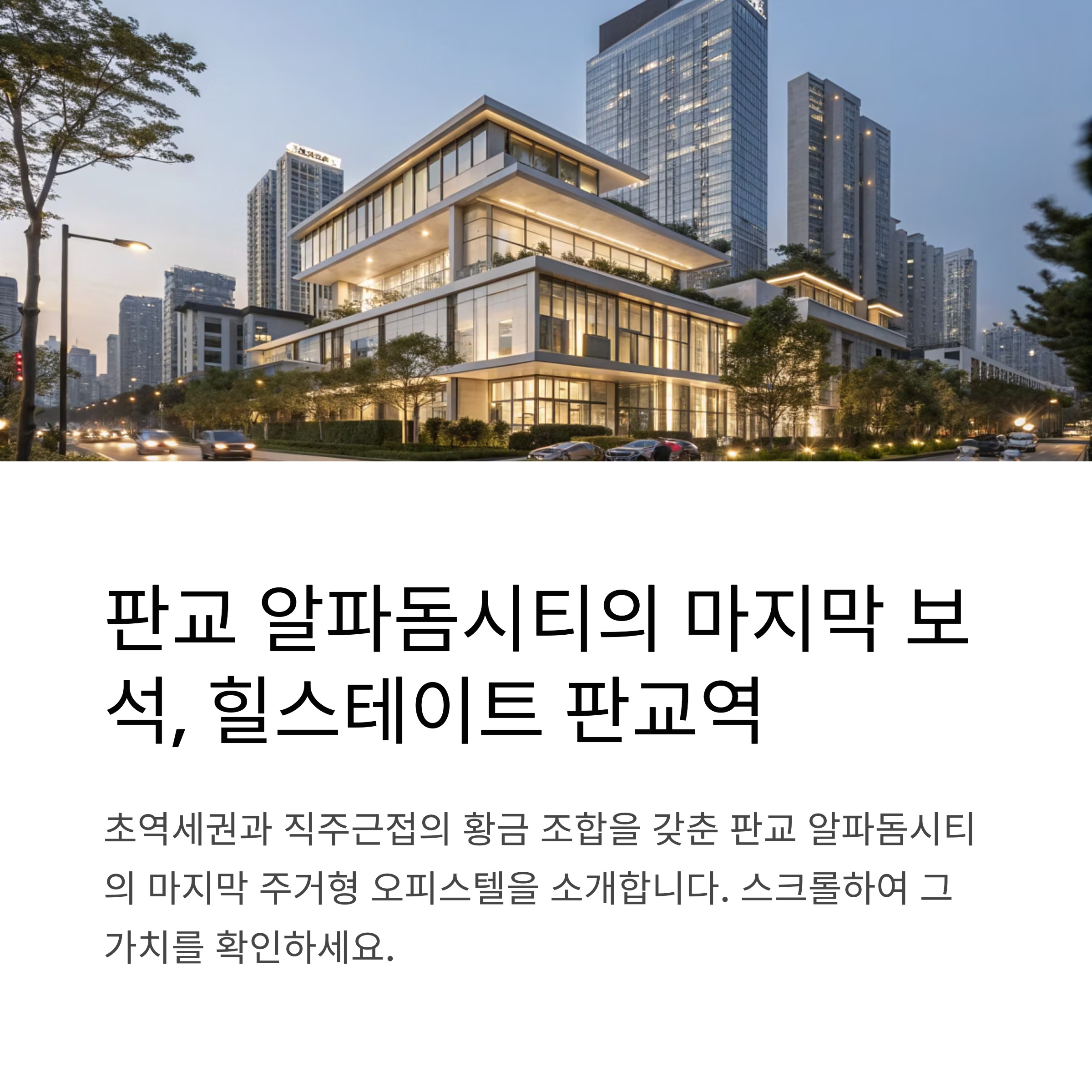 힐스테이트 판교역은 알파돔시티 내 마지막 주거시설로 공급되면서, 희소성과 상징성이 부각되는 오피스텔입니다.