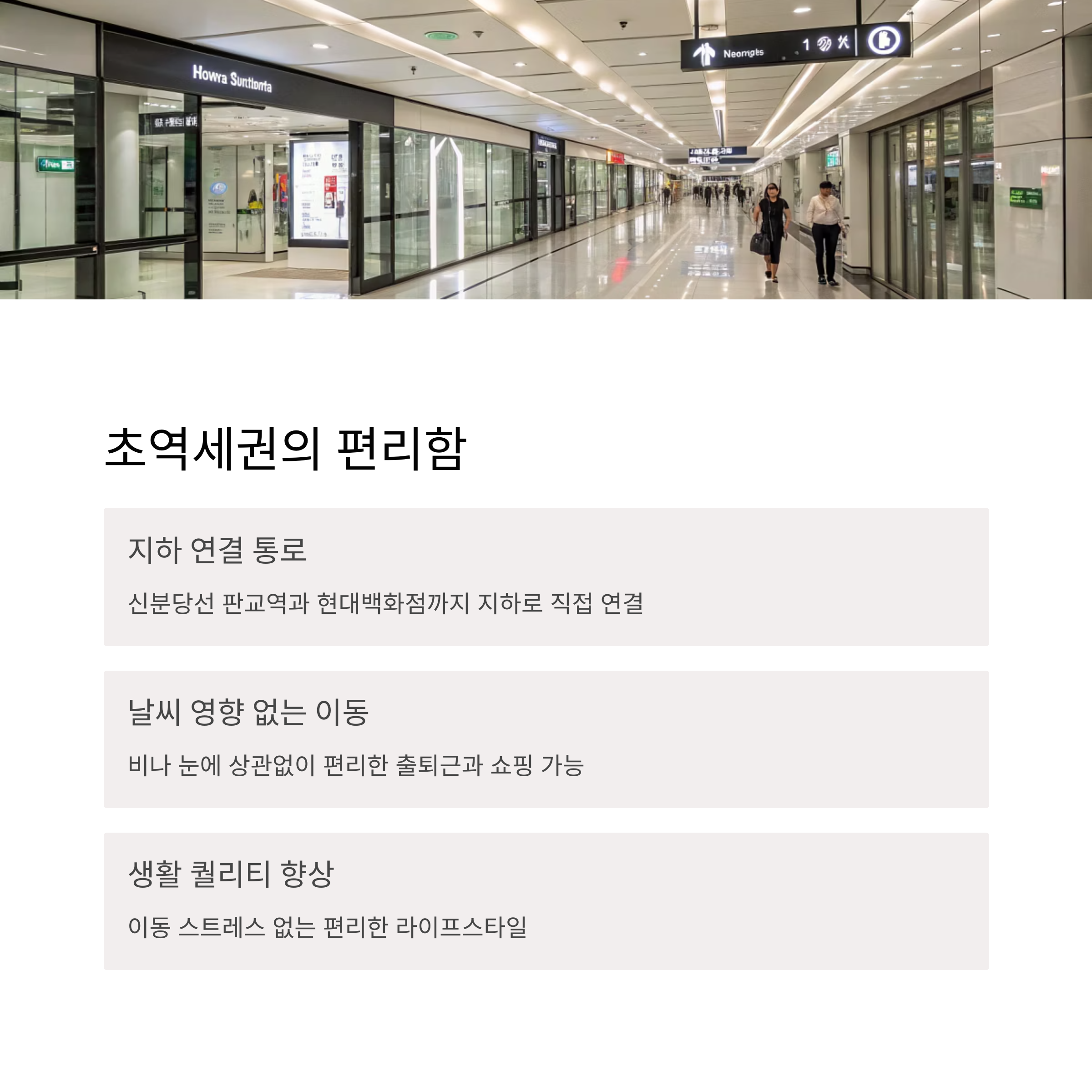 해당 단지는 신분당선 판교역과 현대백화점까지 지하 통로로 바로 연결되는 구조를 갖추고 있어,