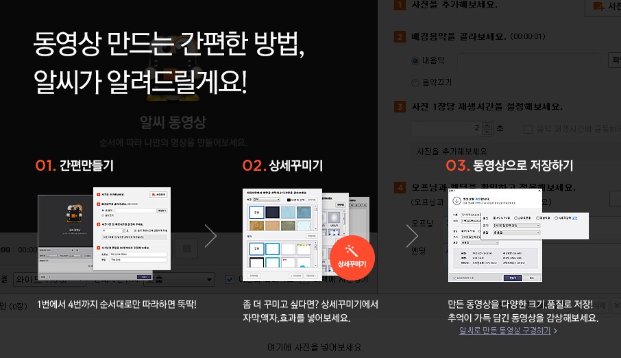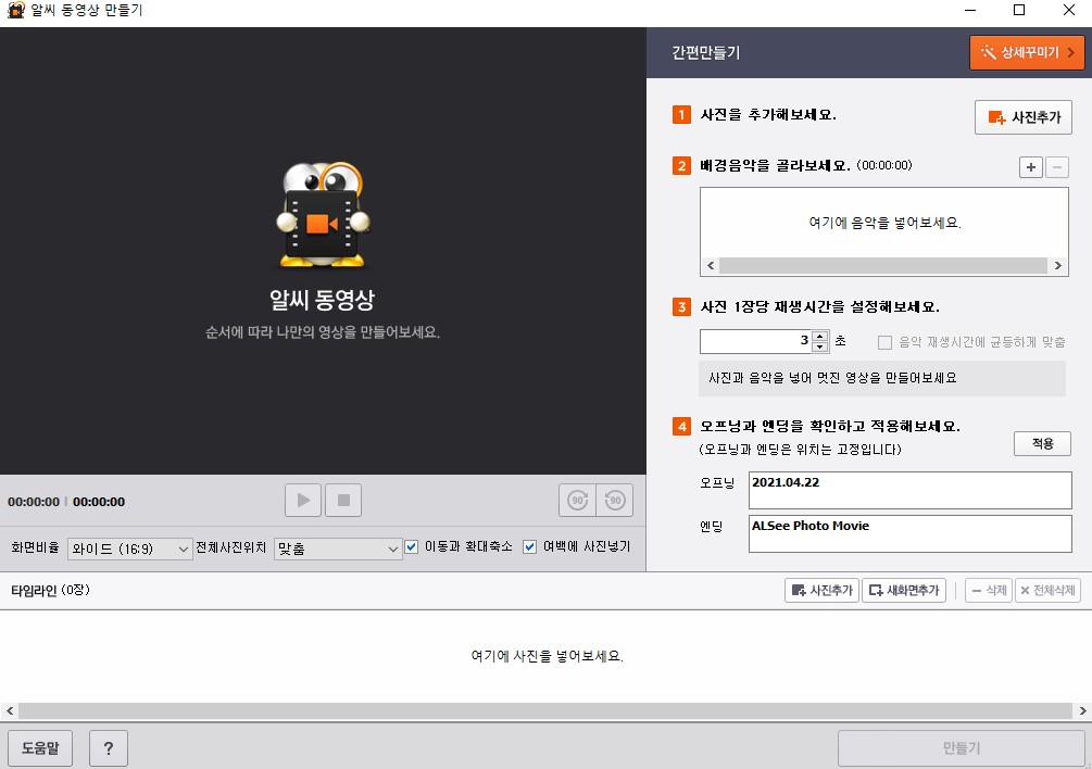 알씨 동영상 만드는 방법이 간단히 안내가 되어있는데요 일단 간편만들기를 적용을 하시고 상세꾸미기를 해주세요