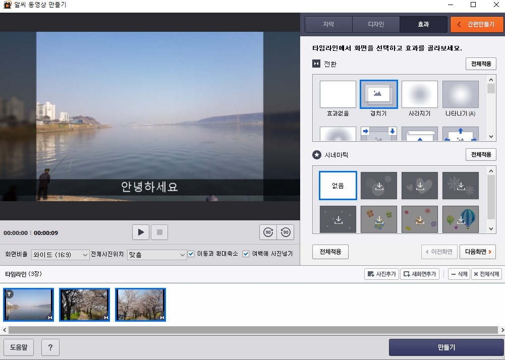 그리고 여러가지 전환효과가 있는데요 겹치기나 아니면 사라지기를 통해서 만들기를 눌러줍니다.