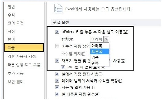 위와같이 고급이 있는데요 여기서 enter키에 대한 방향 설정을 내가 할수 잇습니다 엔터를 눌러서 다음 셀로 오른쪽으로 갈지 아래로 갈지 설정을 해주면 됩니다.