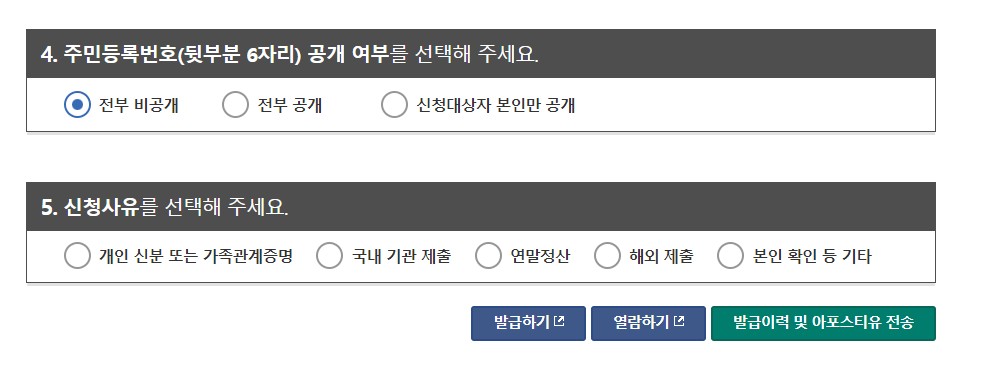 그리고 주민등록번호 전부 비공개 할지 전부 공개할지 선택을 하고 국내기관제출 본인확인등 기타등에 선택을 합니다.