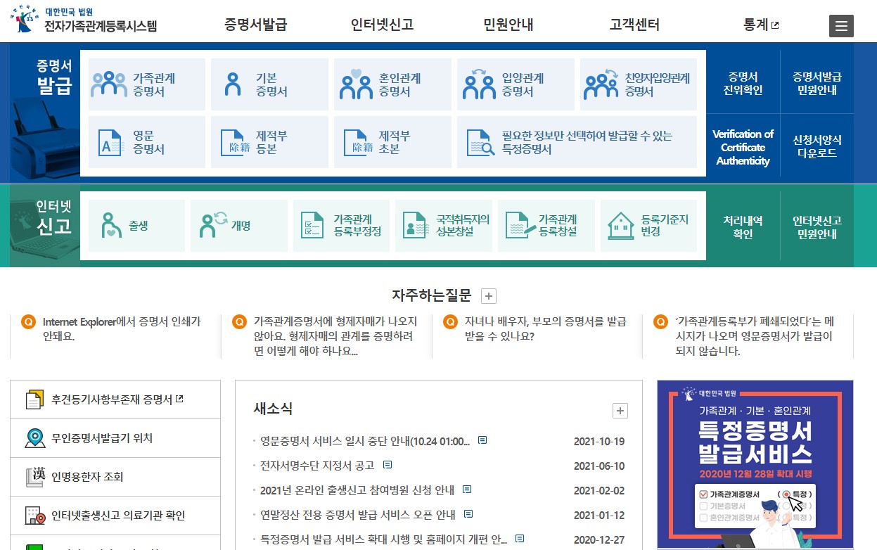 가족관계증명서 인터넷발급 하는 방법