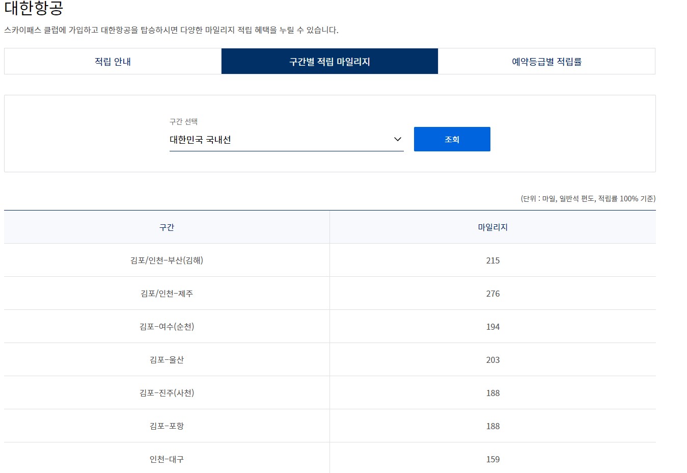 그외에 구간별로 해서 이렇게 국내 항공선을 보면 인천 대구는 159 마일리지가 적립되는 것을 알수 있습니다. 다양하게 내가 가는 목적지에 따라서 해외는 km가 더 많으니까 더 많이 적리되는 것을 우리가 알수 있을거에요
