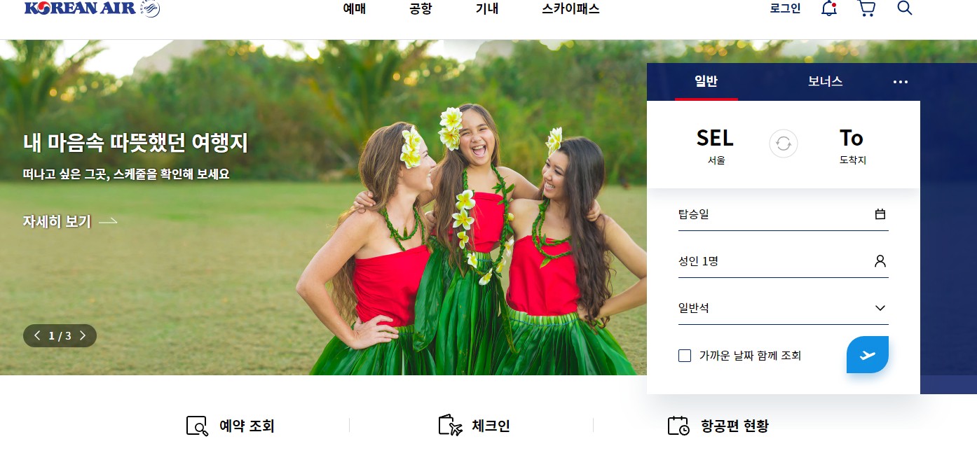 대한항공 korean air 항공 홈페이지를 보면 내가 가고 싶은 목적지에 따라서 예매가 가능하고요 현재 항공편 현황도 살펴볼수 있습니다.