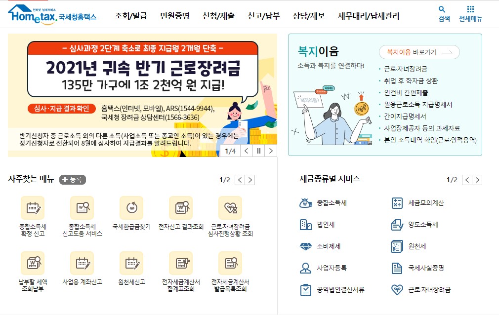 국세청 홈텍스에는 각종 안내를 비롯한 내가 세금종류별 서비스도 받을수 있고요 각종 복지혜택과 검색이 가능합니다. 여기서 근로 자녀 장려금에 대해서 알아보도록 할께요