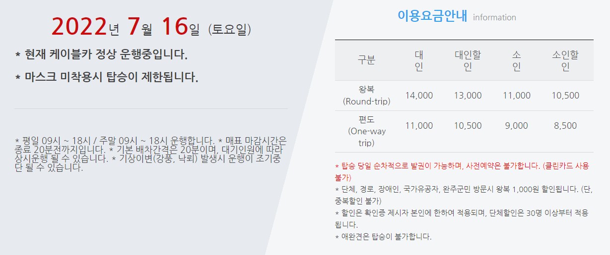 이용요금을 보면 위와같이 왕복과 편도로 해서 대인 14000원 편도는 11000원의 요금이 발생합니다.