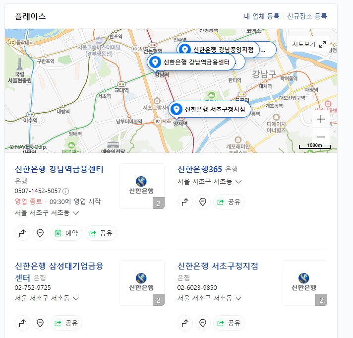네이버에서 해당 위치를 살펴보니까 바로 해당 강남역금융센터등 다양한 은행지점이 나타남을 알수 있네요. 주소와 함께 해당 지역에 바로 방문하면 되겠죠