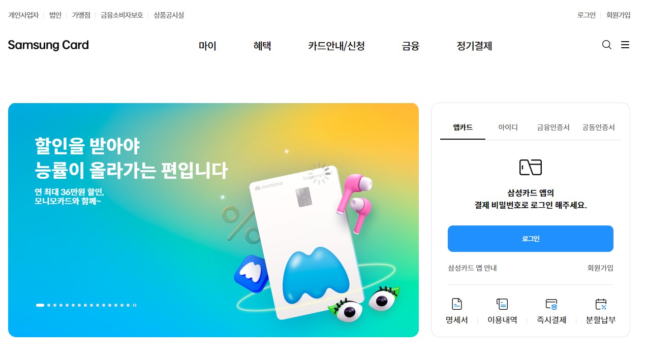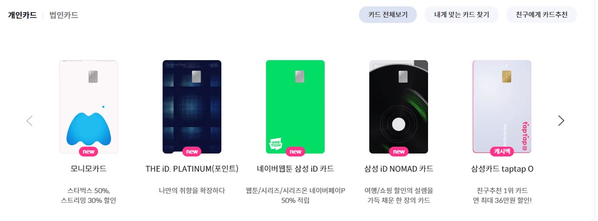 삼성카드 메인 홈페이지에 가면 현재 인기있는 어떤 카드가 제일 어떤 연령대에서 인기있는지 모두 확인이 가능합니다.