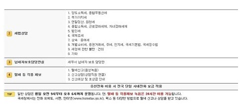 이외에 기타 세정에 대한 불만 세법상담등 해당 사항에 대해서 궁금할때는 국세청 고객센터 126으로 전화해서 상담신청하시면 됩니다.